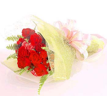 粉色康乃馨(xin)12枝(zhi),白(bai)玫(mei)瑰9枝(zhi),米兰(lan)叶(ye)若干